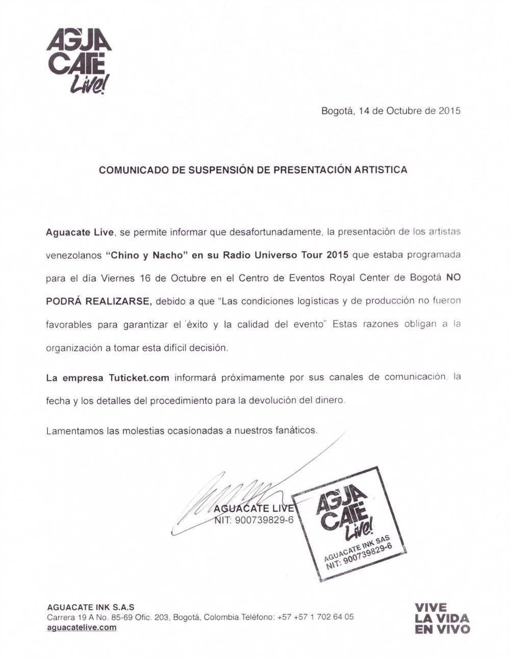 Comunicado Chino y Nacho Laura Moreno 15/10/2015, a las 00:00 Comparte en Facebook en X en Whatsapp en Telegram