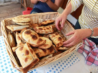Un hombre desde un vehículo aborda a la vendedora que trae varias empanadas en una charola sobre su cabeza.