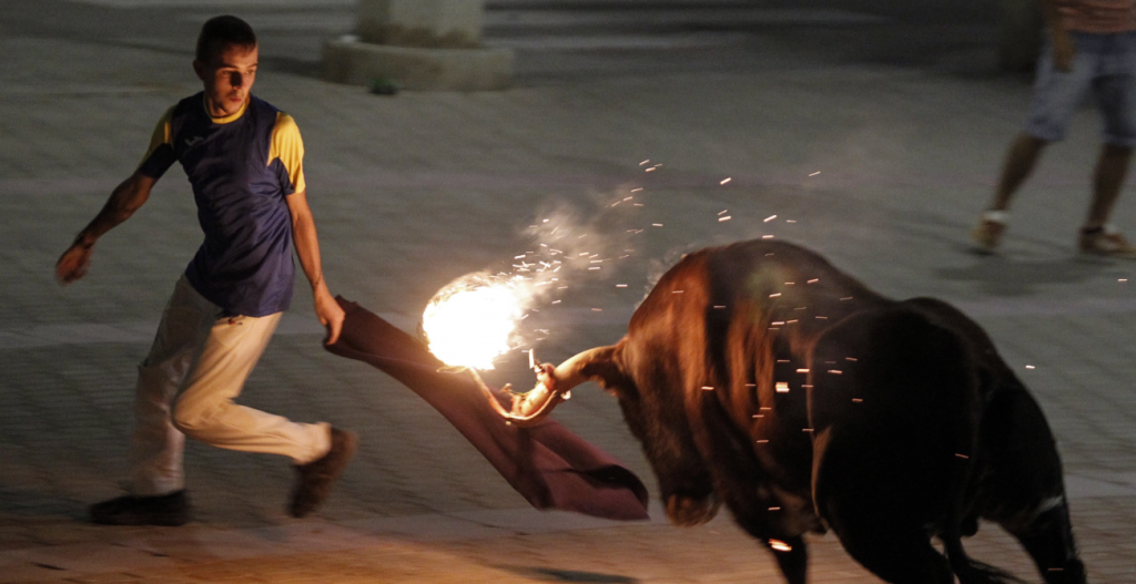 Este corresponde a una fiesta celebrada en Valencia conocida como “Toro embolado”, en el que uno de estos animales se les pone dos bolas prendidas con fuego en sus cuernos.