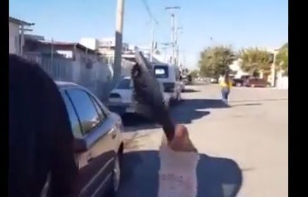 La joven que tomó varios metros de ventaja en la calle, recibió un golpe con la chancla que le lanzó su madre, quien como si fuera un chiste, la tiró al suelo del impacto.