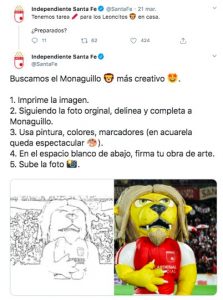 La cuenta oficial de Independiente Santa Fe (@SantaFe), uno de los equipos de fútbol locales más importantes de Bogotá, pensó en sus hinchas más pequeños y creó un concurso para que los niños disfrutaran de un espacio de creatividad en casa. Los que deseen participar deberán decorar de manera creativa la imágen del Monaguillo (mascota oficial del equipo), firmar su obra de arte, tomar una foto y compartirla en Twitter.