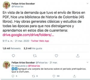 El historiador Felipe Arias (@Feloarias), utiliza su cuenta de Twitter para recomendar los mejores clásicos de la literatura, con el fin de que las personas tuvieran una opción de lectura diferente en el tiempo de aislamiento preventivo. Por esta razón, decidió crear una una biblioteca de 45 libros virtuales que hablan sobre la historia de Colombia. Dentro de la colección los lectores podrán encontrar desde obras generales clásicas, hasta estudios de todas las épocas; para descargarlas, deberán ingresar al enlace en su Tweet: