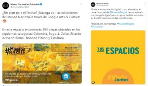 Como alternativa al cierre temporal de los Museos de la ciudad, el Museo Nacional (@museonacionalco) decidió llevar sus salas de exposición hasta la casa de los amantes del arte y la cultura, a través de un recorrido virtual denominado #MuseosEnCasa. Las personas podrán encontrar 390 piezas ubicadas en las siguientes categorías: Colombia, Bogotá, Collar, Ricardo Acevedo Bernal, Roberto Pizano y Escultura; Así mismo, el Museo de Bogotá (@MuseodeBogota), hizo un llamado a todos los capitalinos a que se unieran a una actividad digital, a través de la campaña #MuseodeBogotá y #VivirJuntos, que invita a recuperar las historias sobre las transformaciones vividas. Quienes deseen participar solo deben contar en Twitter su historia, de cómo ha cambiado sus rutinas y espacios en estos días.