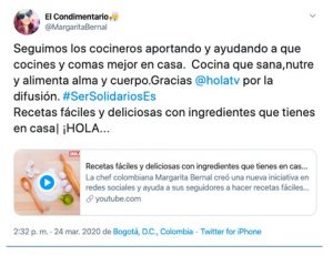 La chef Margarita Bernal (@MargaritaBernal) se ha caracterizado por compartir sus recetas favoritas y escribir sobre gastronomía en su blog, El Condimentario. A raíz de la coyuntura nacional, la chef decidió conectar con sus seguidores de una manera diferente, al proponerles que le escribieran, qué ingredientes tenían en su casa. A cambio ella les daría una receta para que pudieran cocinar un plato diferente durante la cuarentena. Al mismo tiempo, decidió hacer varios Tweets con consejos y recomendaciones acerca de la cocina en casa.