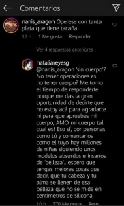 La usuaria le dijo a Natalia en su cuenta de Instagram, “Opérese, con tanta plata que tiene, ¡tacaña!”, dándole a entender que su cuerpo no cumplia con los requerimientos estéticos inmersos en la sociedad. Ante el agresivo comentario, la actriz no pudo aguantar las ganas de responder.