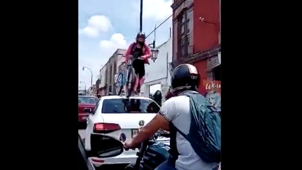 Una ciclista repartidora de DIDI pasó por encima de un vehículo, debido a que el automovilista no respetó la ciclovía en el centro histórico de #Querétaro; el auto resulto dañado. pic.twitter.com/sM9EMUzttL