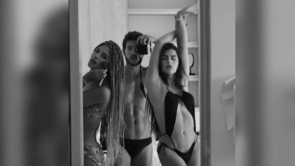 Los rumores empezaron con la publicación de videos y fotos bastante candentes de los tres, en los que se veía a las dos modelos besándose, bañándose sin ropa en piscinas y dándose muestras de cariño.