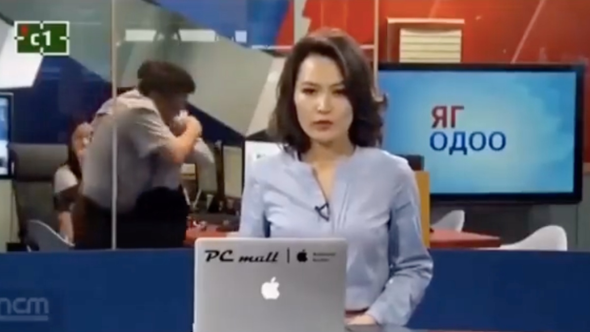 En el video se ve a una presentadora transmitiendo las noticias para el canal C1 de Mongolia, sin embargo, ella no se percata de lo que está sucediendo detrás suyo.