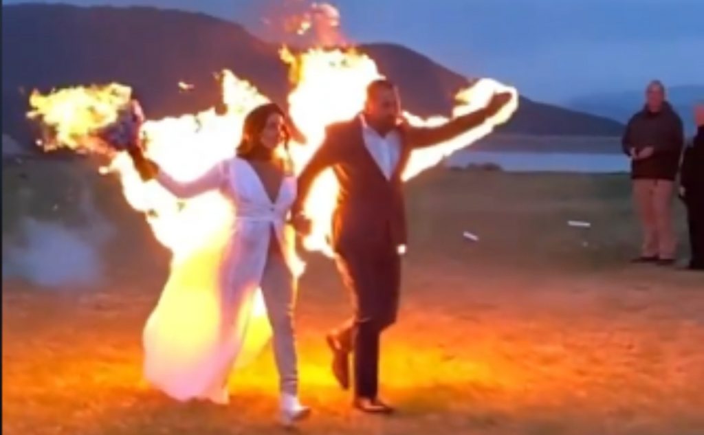 ¡Candente celebración! Pareja de recién casados se prenden fuego para celebrar su boda
