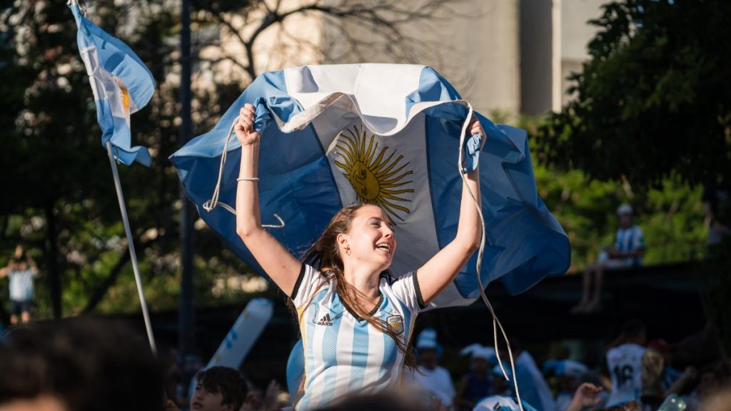 A pesar de que la aficionada no mostró su rostro a la cámara, se le puede ver saltando mientras sostiene entre sus manos parte del uniforme de la ‘Albiceleste.