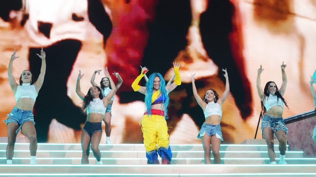 Luego de una pausa, en la que aprovechó para cambiarse de vestuario y lucir un pantalón y crop top con los colores dela bandera de Colombia, Karol G salió al escenario y regaló su versión de varios éxitos latinos.