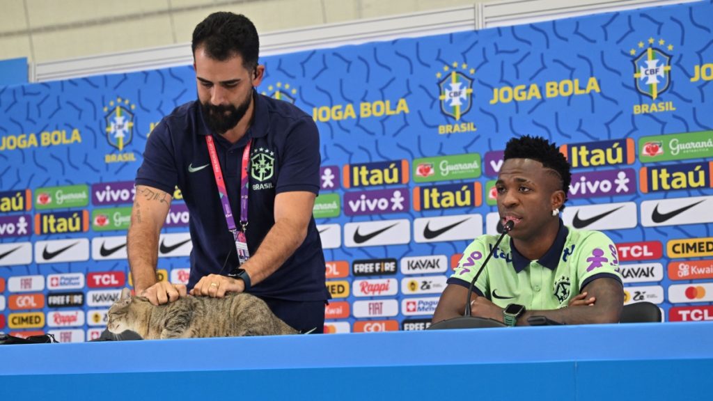 Se trató de un pequeño gato que se coló en la sala de prensa de la concentración de la selección brasileña, mientras Vinicius Junior atendía a los medios de comunicación este miércoles, previo al duelo que disputarán el próximo viernes frente a Croacia en los cuartos de final.