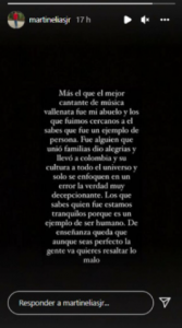 “Más que el mejor cantante de música vallenata fue mi abuelo y los que fuimos cercanos a él sabemos que fue un ejemplo de persona. Fue alguien que unió familias, dio alegrías y llevó a Colombia y su cultura a todo el Universo. Que solo se enfoquen en un error , de verdad, es muy decepcionante”, empezó escribiendo el hijo mayor del fallecido Martín Elías.