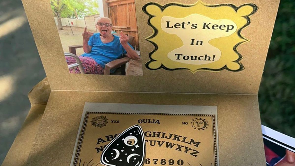 La joven quedó sorprendida cuando recibió una caja con una tabla oujia hecha a mano, junto con la imagen de su abuela sacando la lengua y haciendo ‘pistola’ con su dedo medio. “Mantengámonos en contacto”, rezaba el mensaje al costado de la fotografía de Jodie.
