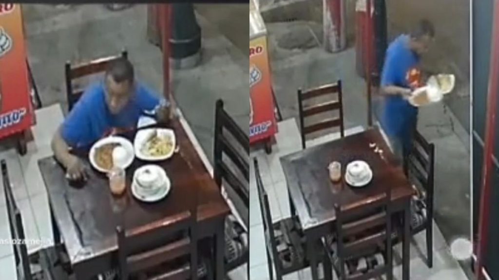 En video quedó registrado el momento en que luego de algunos bocados, el hombre emprendió la huida robándose hasta los platos.