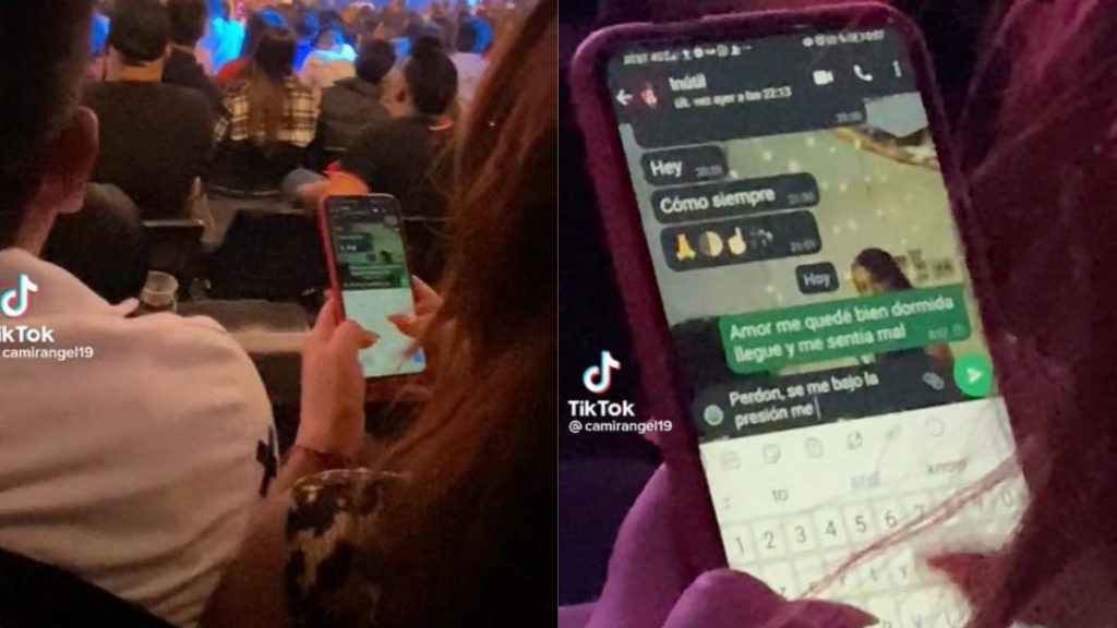 Como registró la grabación, la mujer estaba departiendo en un establecimiento junto a un hombre cuando su novio le escribió. La pareja no se dio cuenta que una persona ubicada en la parte trasera estaba registrando el chat.