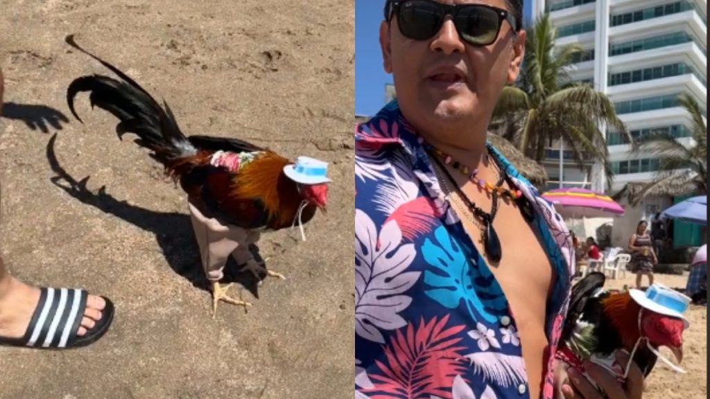 Sin embargo, otra de las razones que hacen aún más particular el video es el atuendo del animal, quien lleva sombrero de copa una camisa y pantalones, además, la persona que lo acompaña le reclama, “me da vergüenza que vengamos de vacaciones y te traigas al gallo”, dice la mujer.