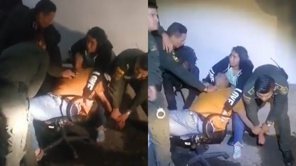 En la grabación se ve a tres agentes sosteniendo a Carmona, quien forcejea desde una silla, dos de ellos lo sostienen a cada brazo y uno por los pies.
