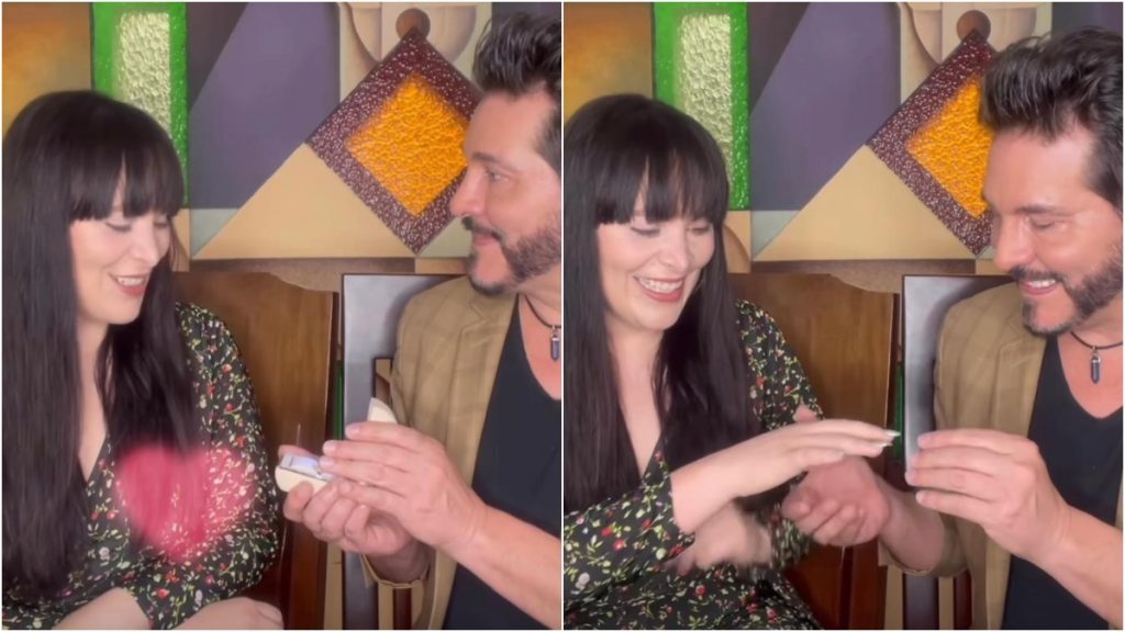 Una vez la artista terminó de pronunciarse sobre el matrimonio, Cezán sacó de su bolsillo un cofre con argollas. “¿Mi amor te quieres casar conmigo? ¿quieres renovar los votos conmigo?”, preguntó Cezán.