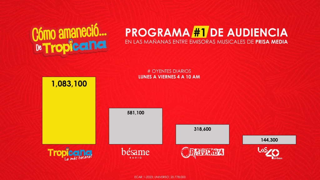 De lunes a viernes, entre las 4:00 y 10:00 de la mañana, el programa ‘Cómo Amaneció Bogotá’ de Tropicana supera el millón de oyentes, según la reciente medición de ECAR; lo que lo posiciona como el número 1 en audiencia en las mañanas, entre las emisoras musicales de Prisa Media.