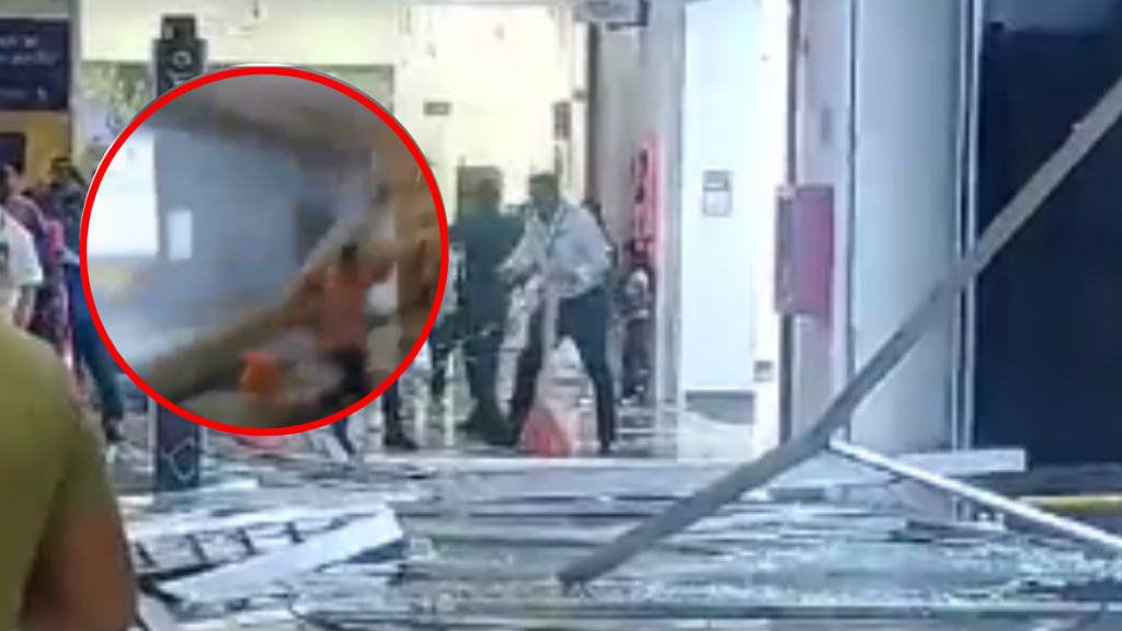 De repente, cae la puerta de vidrio. Todas las personas reaccionan de inmediato y corren para evitar ser heridos. En el video se observa a un hombre que, por pocos segundos y por pocos centímetros casi es aplastado por los vidrios.