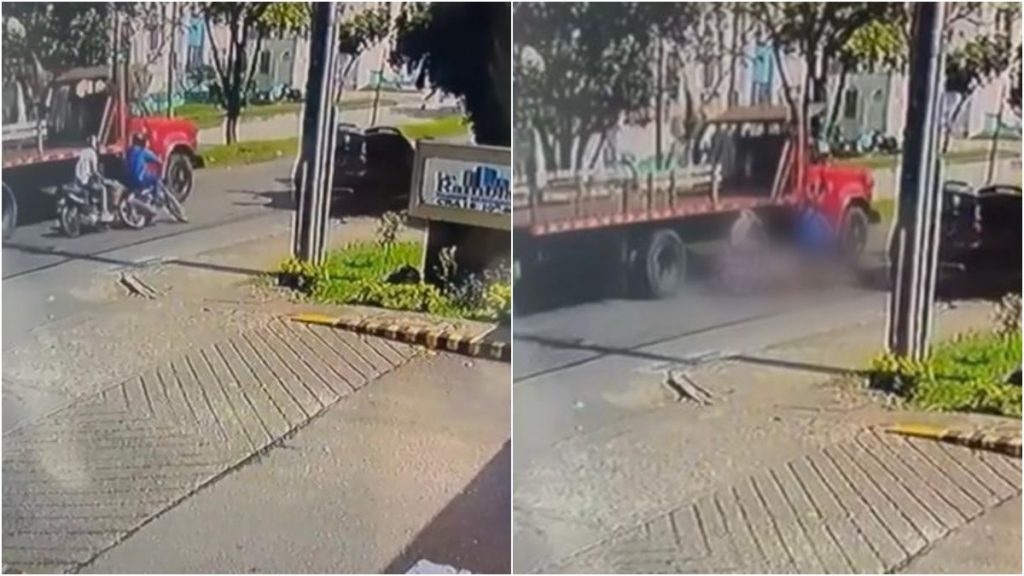 Una cámara de seguridad de la zona captó el accidente en la avenida 19, frente al conjunto residencial Las Ramblas, según informó Noticias Caracol. Como quedó en la grabación, los sujetos habrían intentado pasar a alta velocidad al camión que estaba junto a ellos.