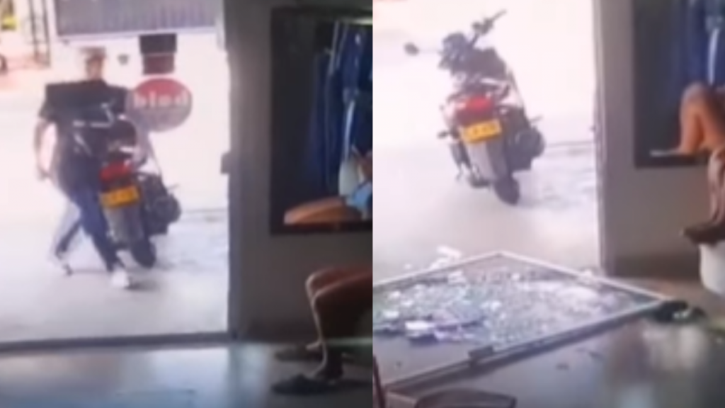 Un hombre llegó al negocio y con una fuerte patada derribó la puerta de vidrio del lugar. En las imágenes se observa cómo se rompe el vidrio y cae el marco de la puerta.