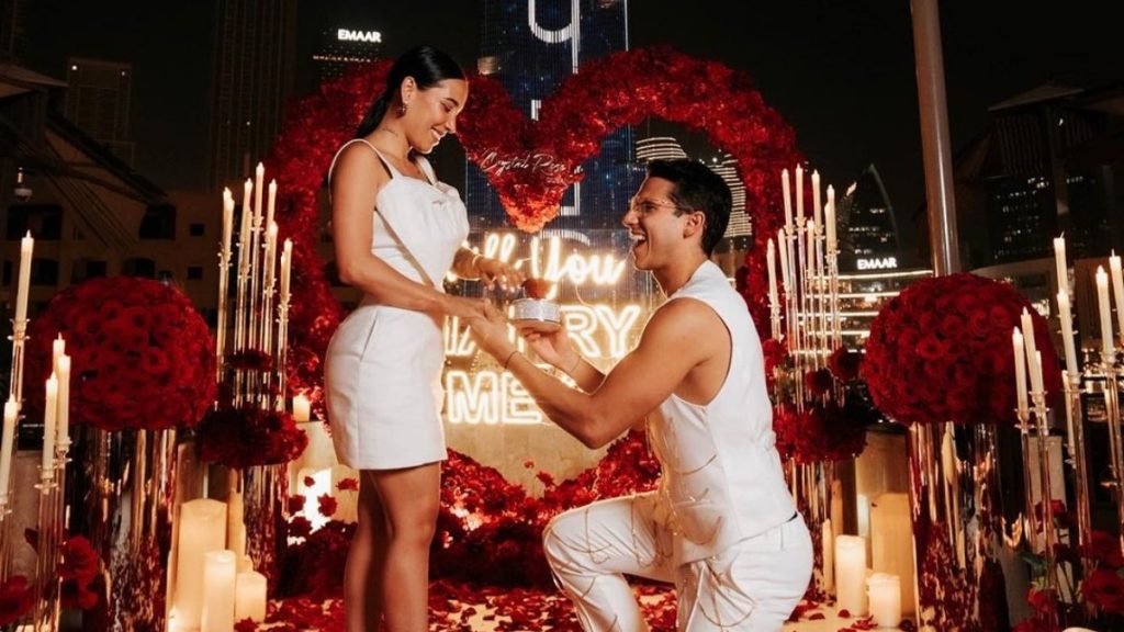 Allí, el artista preparó una sorpresa repleta de flores y velas blancas ante la majestuosidad de los edificios de Dubái, un mensaje en un corazón con la romántica propuesta y el lujoso anillo, detalles con los que Bueno logró el “sí” de su pareja.