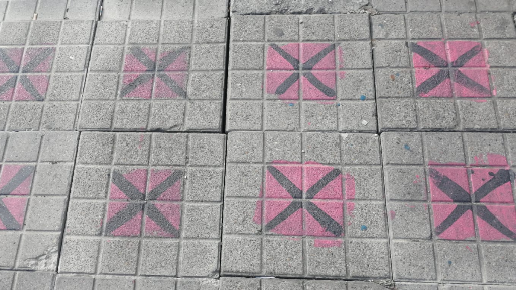 En los últimos meses, los transeúntes se han fijado que algunas baldosas de varios andenes de Bogotá están pintadas de color fucsia y una equis negra grande.