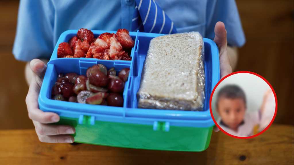 El protagonista del video es un niño, que tendría cerca de cuatro años. El pequeño está almorzando en el colegio. Mientras está comiendo, la maestra se acerca y le dice: