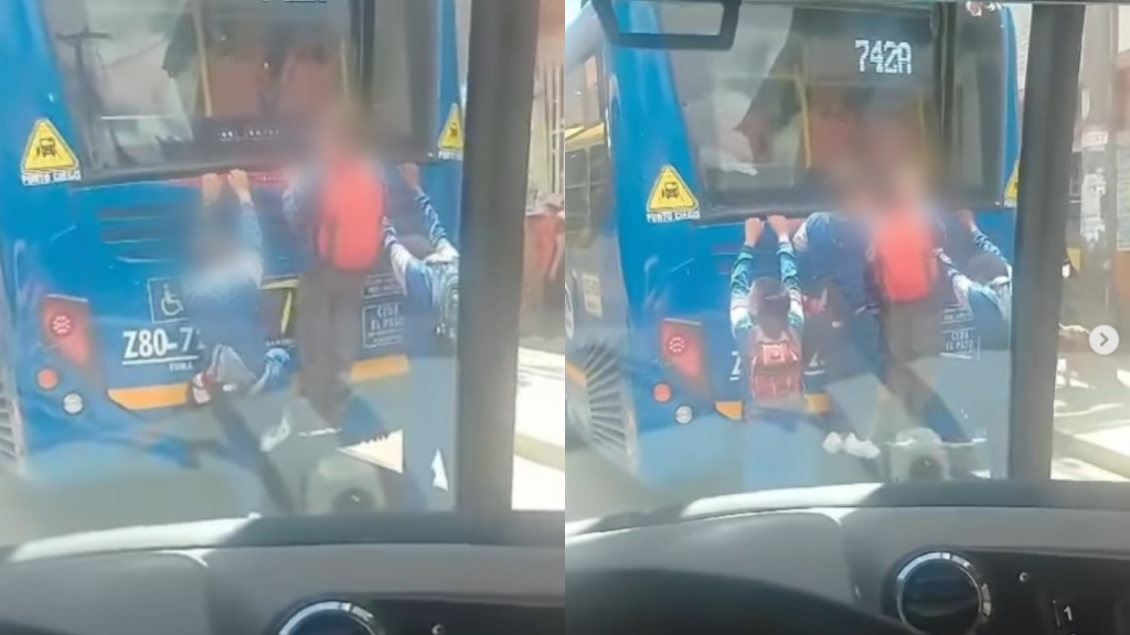 En el video que fue publicado por cuenta en Instagram por una cuenta llamada Denuncias ciudadanas se ve el momento en que cuatro estudiantes uniformados se trepan al bus agarrándose de las rendijas que este tiene en su parte trasera.