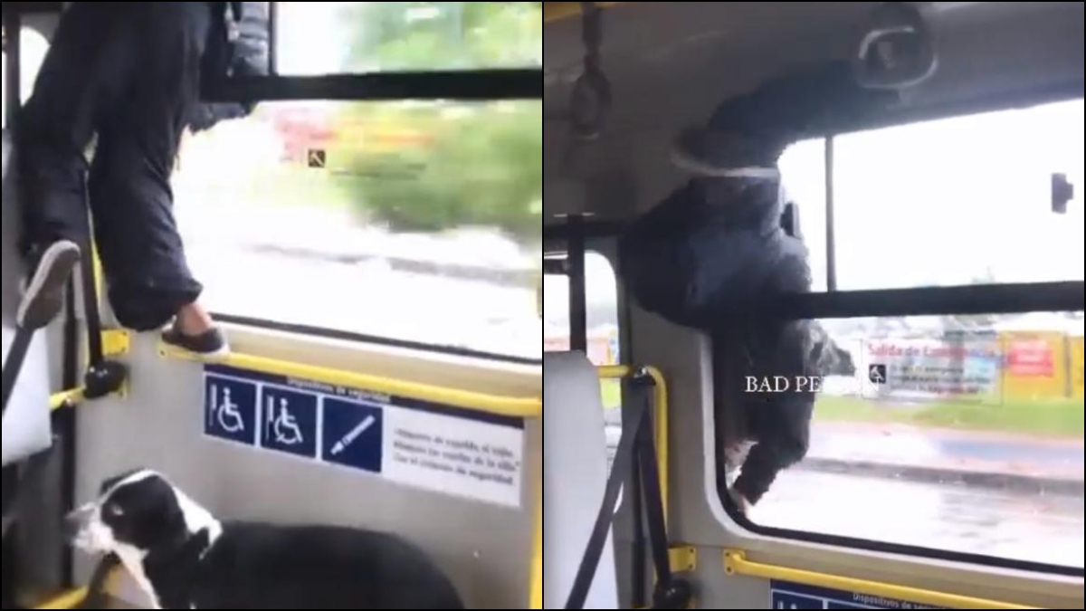 En la grabación, que dura algunos segundos, se aprecia al sujeto luchar y contorsionar su cuerpo para hacerlo entrar por la angosta ventanilla del bus.