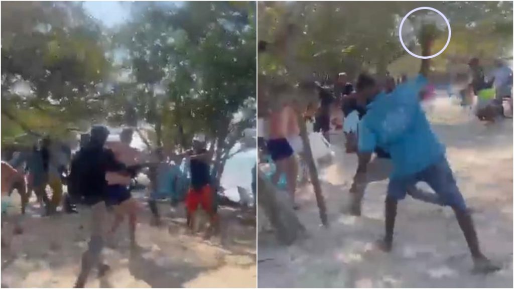 En la grabación se aprecia a los visitantes lanzándose sillas y varios objetos con los residentes, incluyendo piñas y cocos. Se aprecia que varios de los trabajadores del sector pidieron que se detuviera la disputa: “Eso es malo, ¡no, no!”, se escucha decir a un hombre al ver a otro golpear al turista con una silla.