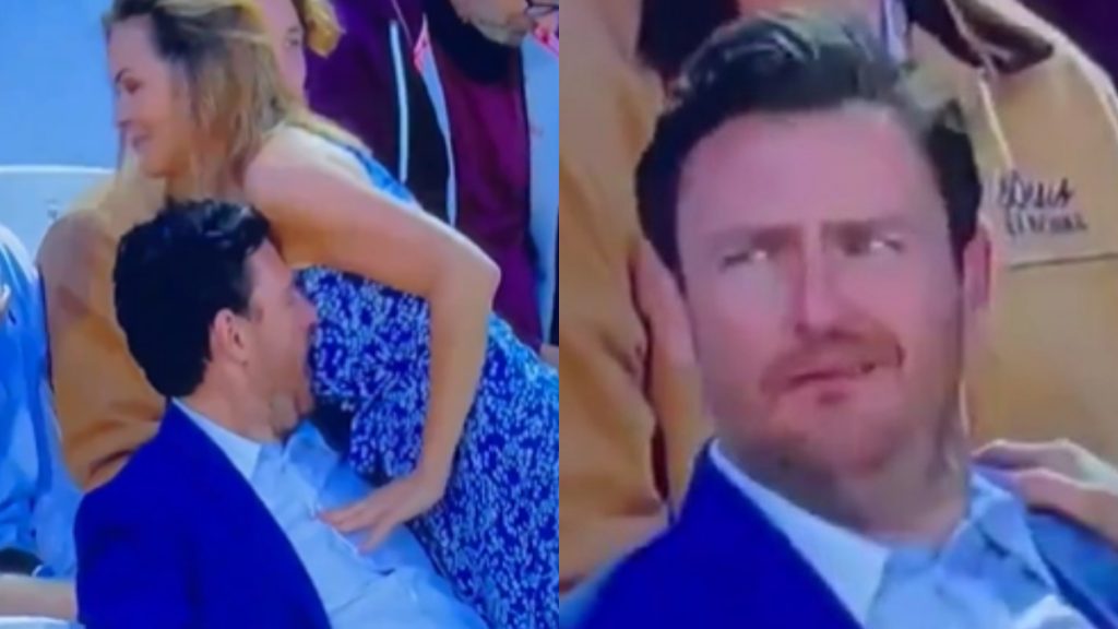 Mientras los futbolistas estaban calentando para su encuentro en la cancha, las cámaras captaron a una mujer que se levanta del puesto para hablar con una persona que está detrás de ella, al acercarse deja que su pecho quede muy cerca de su pareja, quien no duda en aprovechar la ocasión.