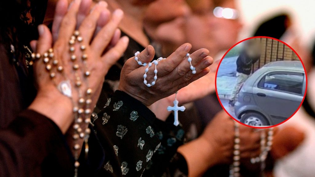 La cámara de seguridad del lugar captó el momento en que el sujeto ingresó al recinto y amenazó a las mujeres que estaban orando. La mujer que estaba de rodillas le entregó sus pertenencias, dinero y hasta algunos de sus accesorios, mientras que otra de las víctimas le hizo señal de que no llevaba más elementos con ella.