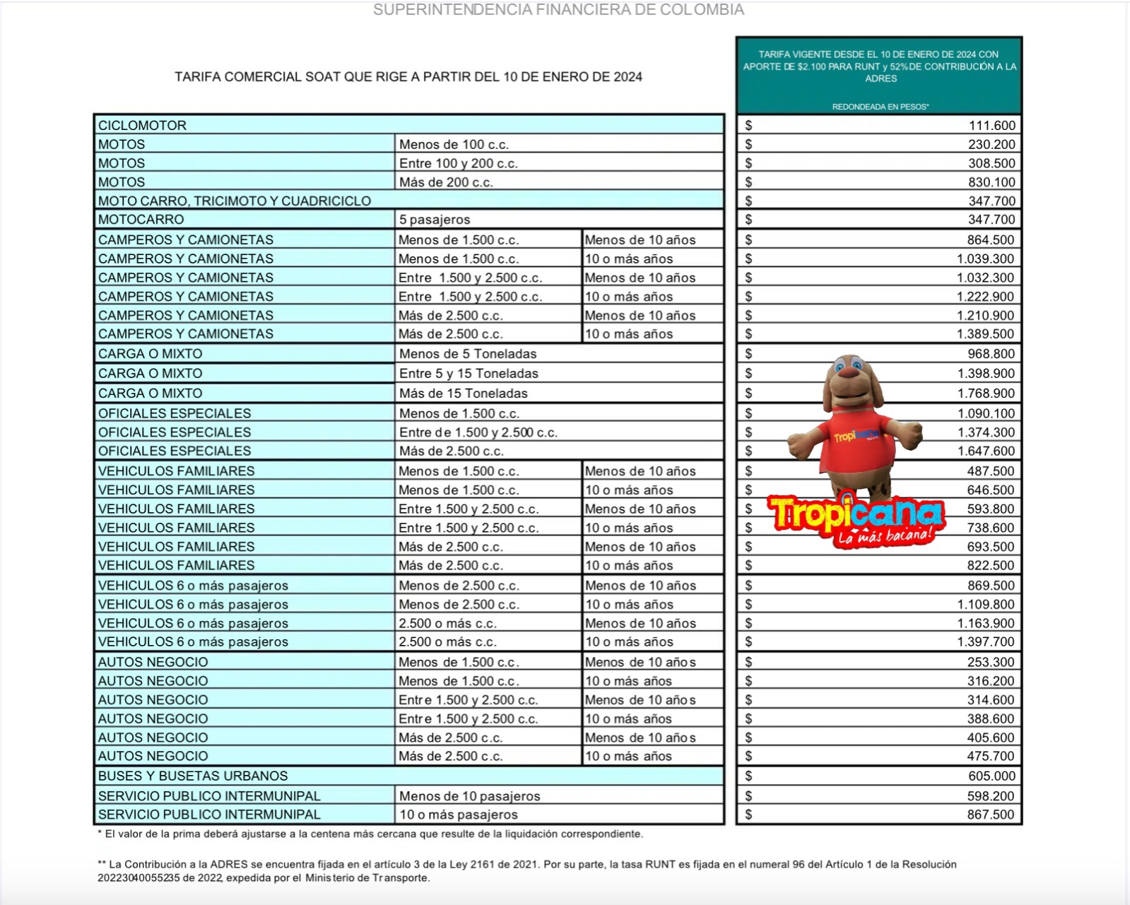 Según señaló la Superfinanciera, el ajuste se hizo con base en la revisión periódica de las condiciones técnicas y financieras del seguro, es decir el costo estimado de la atención de las personas lesionadas en accidentes de tránsito, el aumento del número de los accidentes asegurados y la composición del parque automotor asegurado.