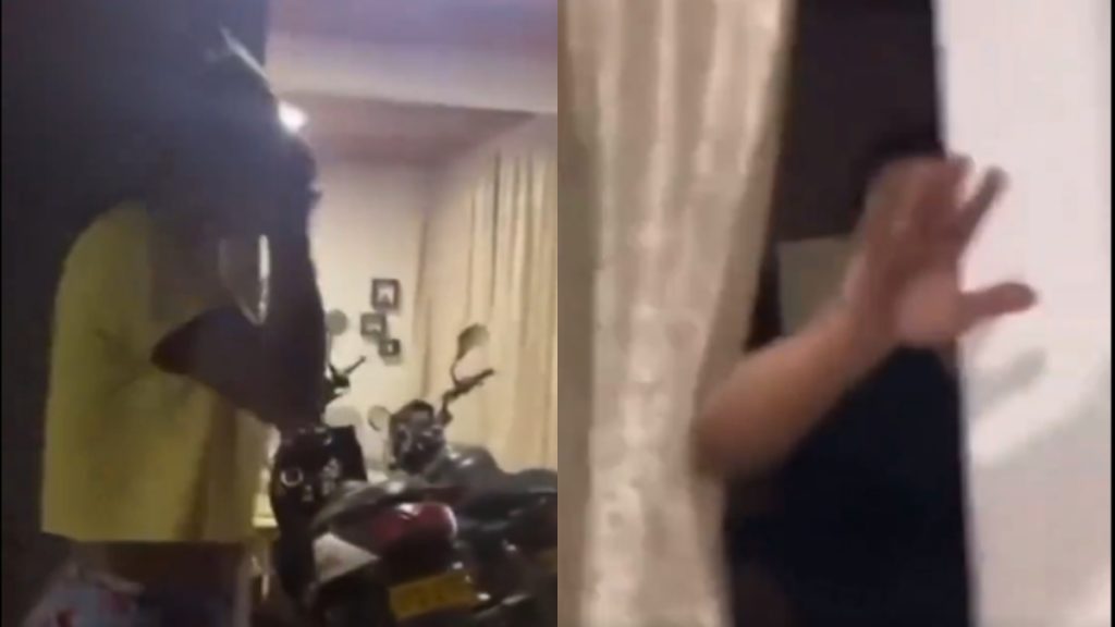 “Llego a mi casa y encuentro a mi esposa con este compañerito. Qué bonito el compañero que tengo de la Sijín, ¿cierto?, qué bonito compañero, gracias. Qué bonito, el que mucho habla, poco hace. Miré hasta le dejó guardar la moto en la casa”, comienza diciendo el uniformado mientras registra toda la escena que encontró en su casa.
