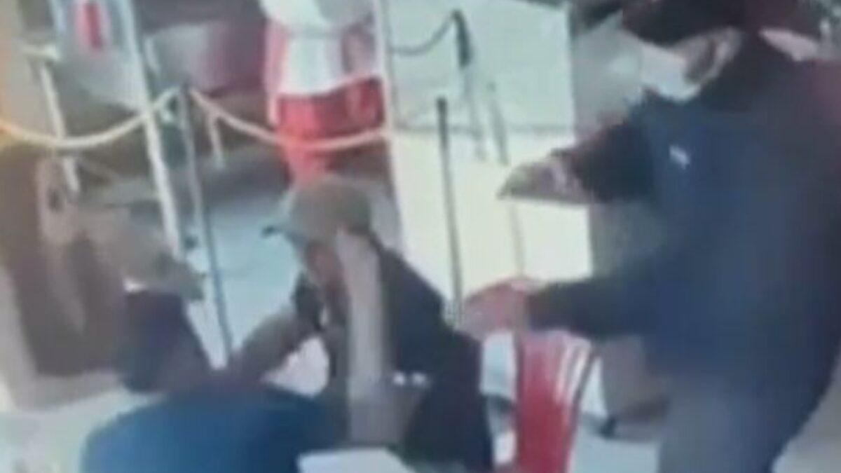 En los videos del asalto y tiroteo que se hicieron públicos en redes sociales se ve el momento en que uno de los asaltantes ingresa al lugar e intenta robar al policía retirado, por lo que este reacciona y se defiende con otra arma.