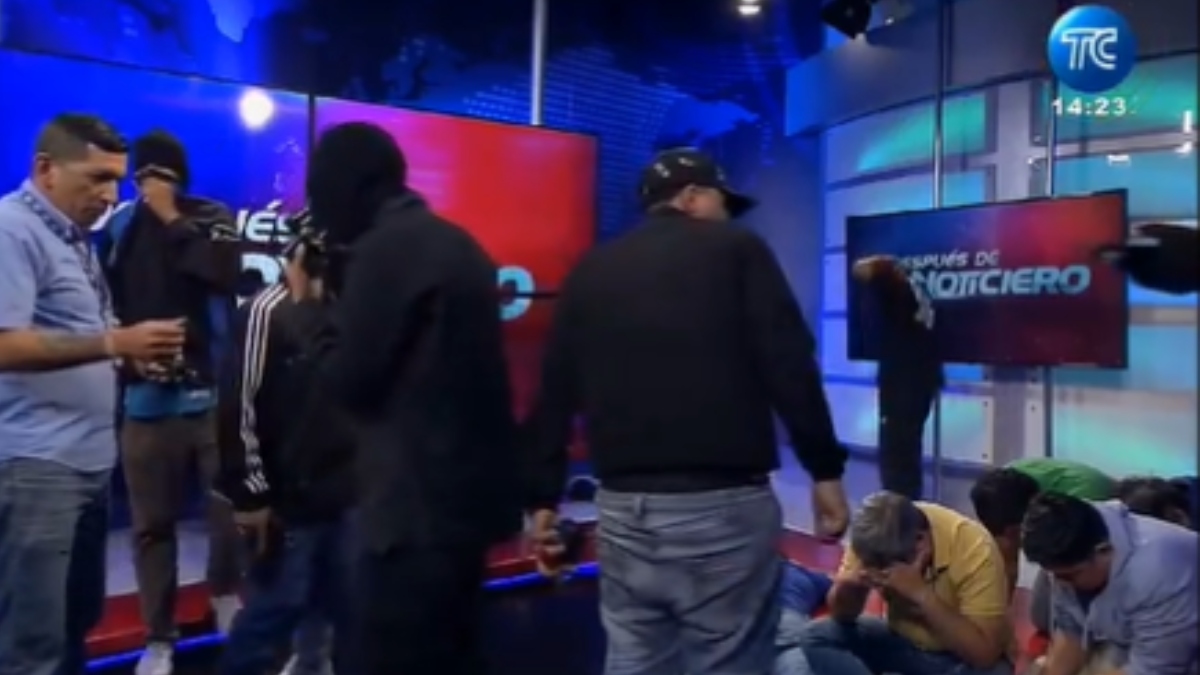 ?? | URGENTE: Imágenes de televisión en vivo muestran figuras encapuchadas dentro de la televisora TC de Ecuador, obligando al personal a tumbarse en el suelo.