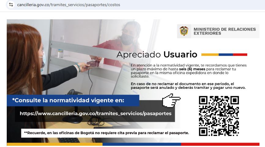 “Apreciado usuario: en atención a la normatividad vigente, te recordamos que tienes un plazo máximo de hasta seis (6) meses para reclamar tu pasaporte en la misma oficina expedidora en donde lo solicitaste. En caso de no reclamar el documento en ese periodo, el pasaporte será anulado y deberás tramitar y pagar uno nuevo”, se lee en el portal web.