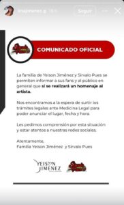 La hermana de Yeison Jiménez, Lina Jiménez, publicó un comunicado en sus redes sociales asegurando que las exequias del artista serán en la ciudad de Bogotá. Sin embargo, aun no hay fecha y lugar confirmados. “En medio de nuestro dolor queremos llamar a la prudencia y responsabilidad con la información y los comunicados. Aun no tenemos fecha, hora y lugar confirmados para los homenajes a Yeison, no obstante, algunas entidades horarios y fecha. Nosotros aun no la hemos podido estructurar y tenemos que cumplir con los protocolos de Medicina Legal. Aun no tenemos sus restos mortales. Toda información será por los canales oficiales de la organización y su jefe de prensa”, comentó Jiménez.