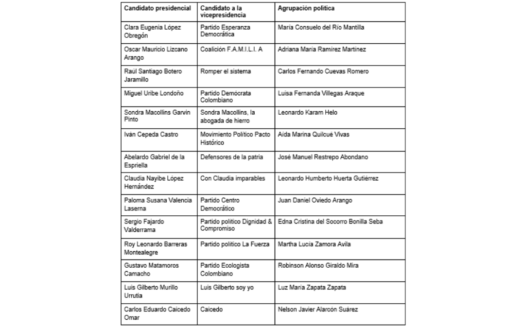 A su vez, la Registraduría mencionó que el sorteo mediante el cual se definirá la posición de los candidatos en la tarjeta electoral se realizará el 25 de marzo en el Centro de Convenciones Ágora Bogotá, por lo que anunció la lista oficial de los candidatos, así como su agrupación política y fórmula vicepresidencial. Estos son los candidatos inscritos: